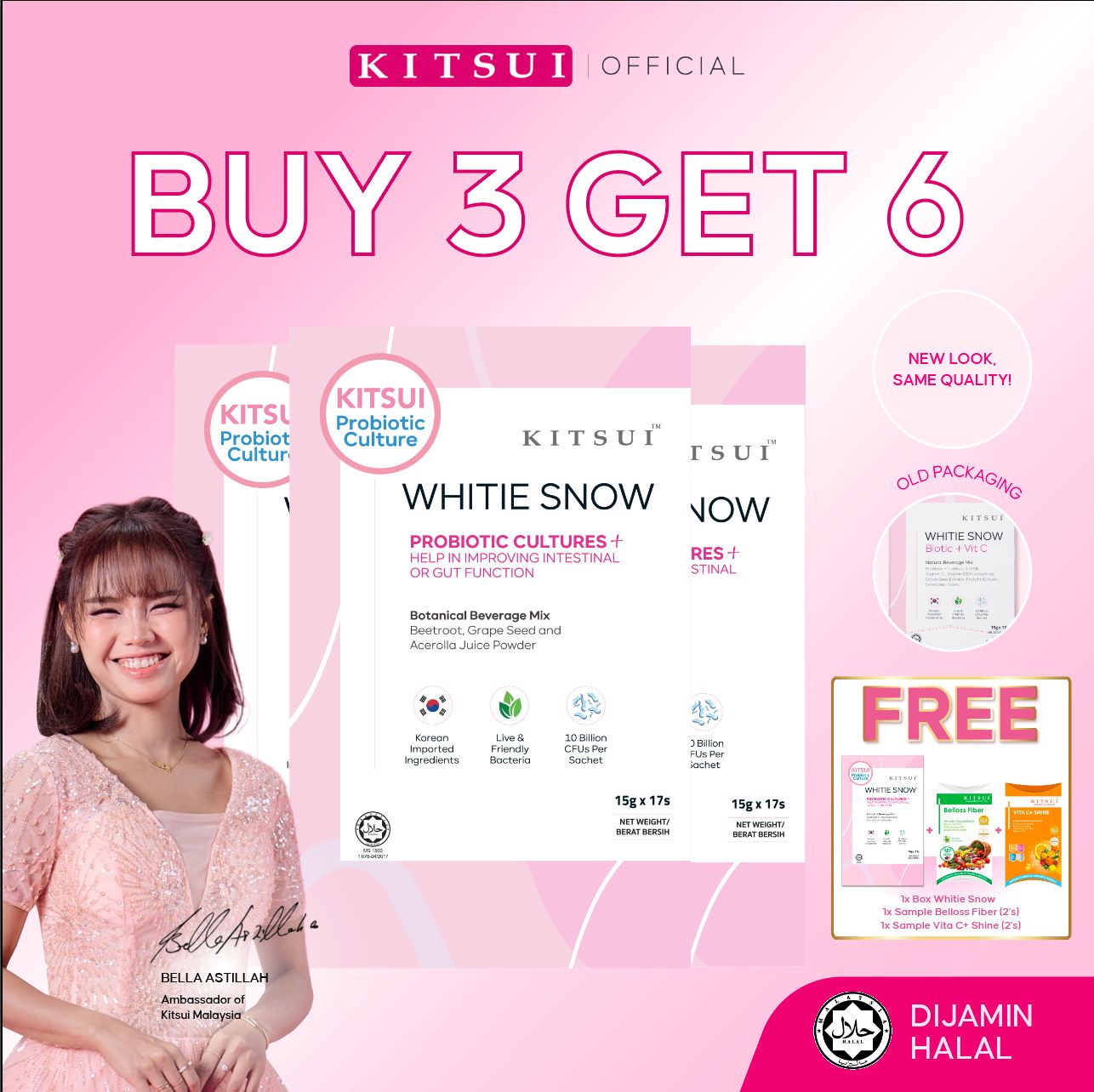 [BUY 3 GET 6] KITSUI Whitie Snow x3 [FREE 1x Whitie Snow + 1x Vita C+Shine 2's + 1x Belloss Fiber 2's] Supplement | Halal | Minuman Berperisa Beri Dengan Vitamin & Probiotik | Kulit Berseri