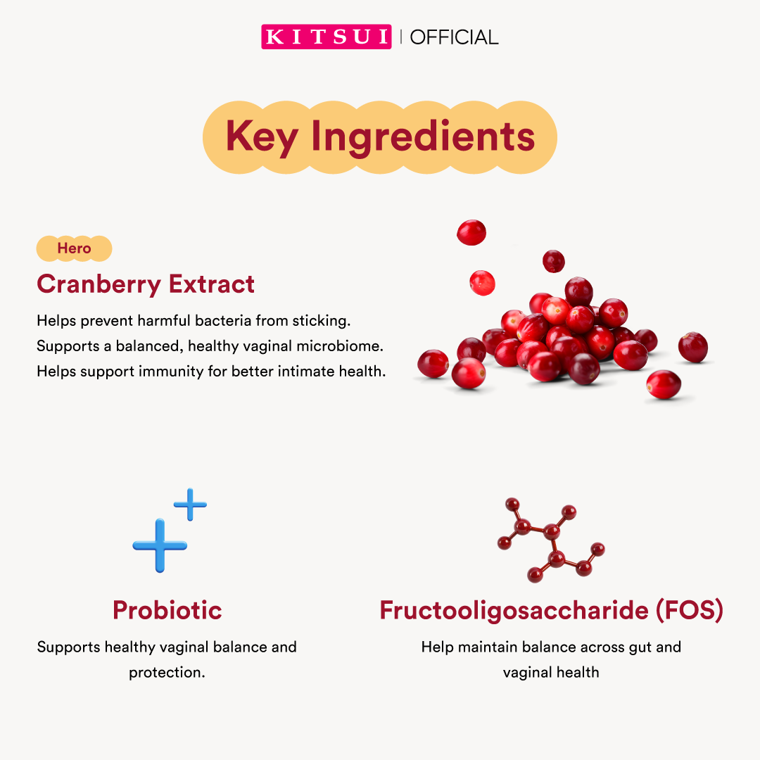 Gabungan ekstrak cranberry, probiotik dan prebiotik membantu menyokong keseimbangan bakteria baik dan kesejahteraan kawasan intim secara menyeluruh.