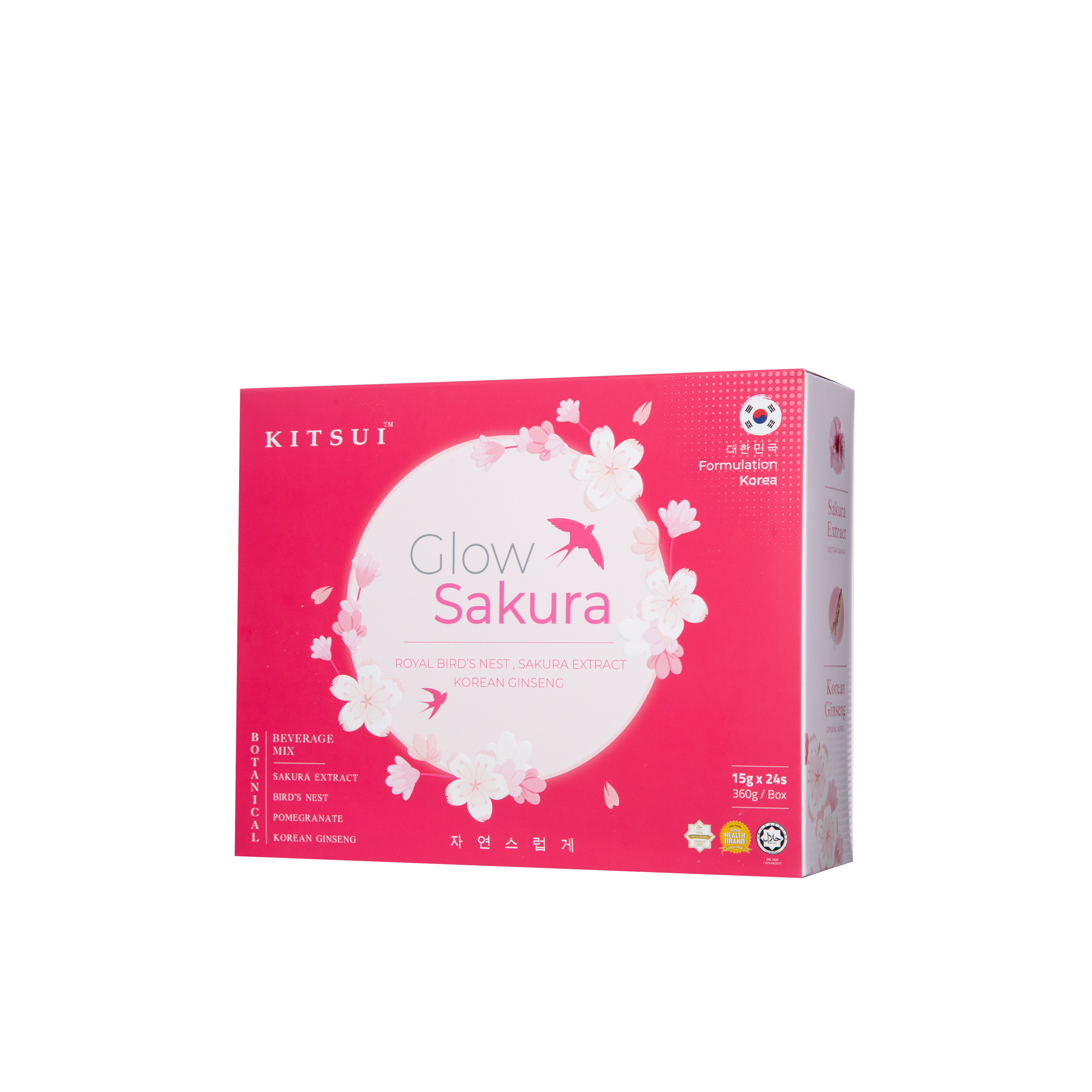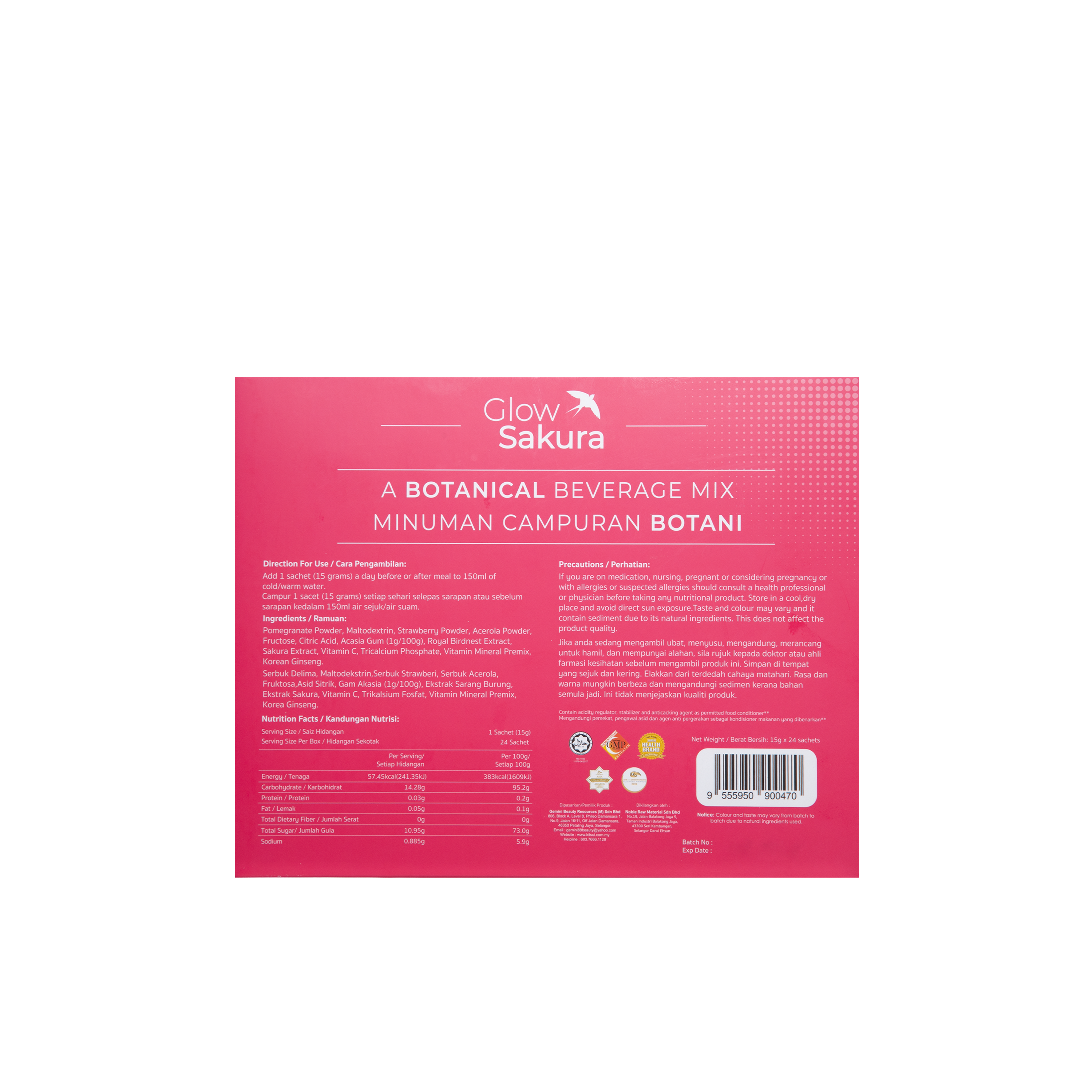 Minuman berperisa delima dengan ekstrak sakura dan sarang burung untuk mencerahkan, melembap dan menyegarkan kulit.
