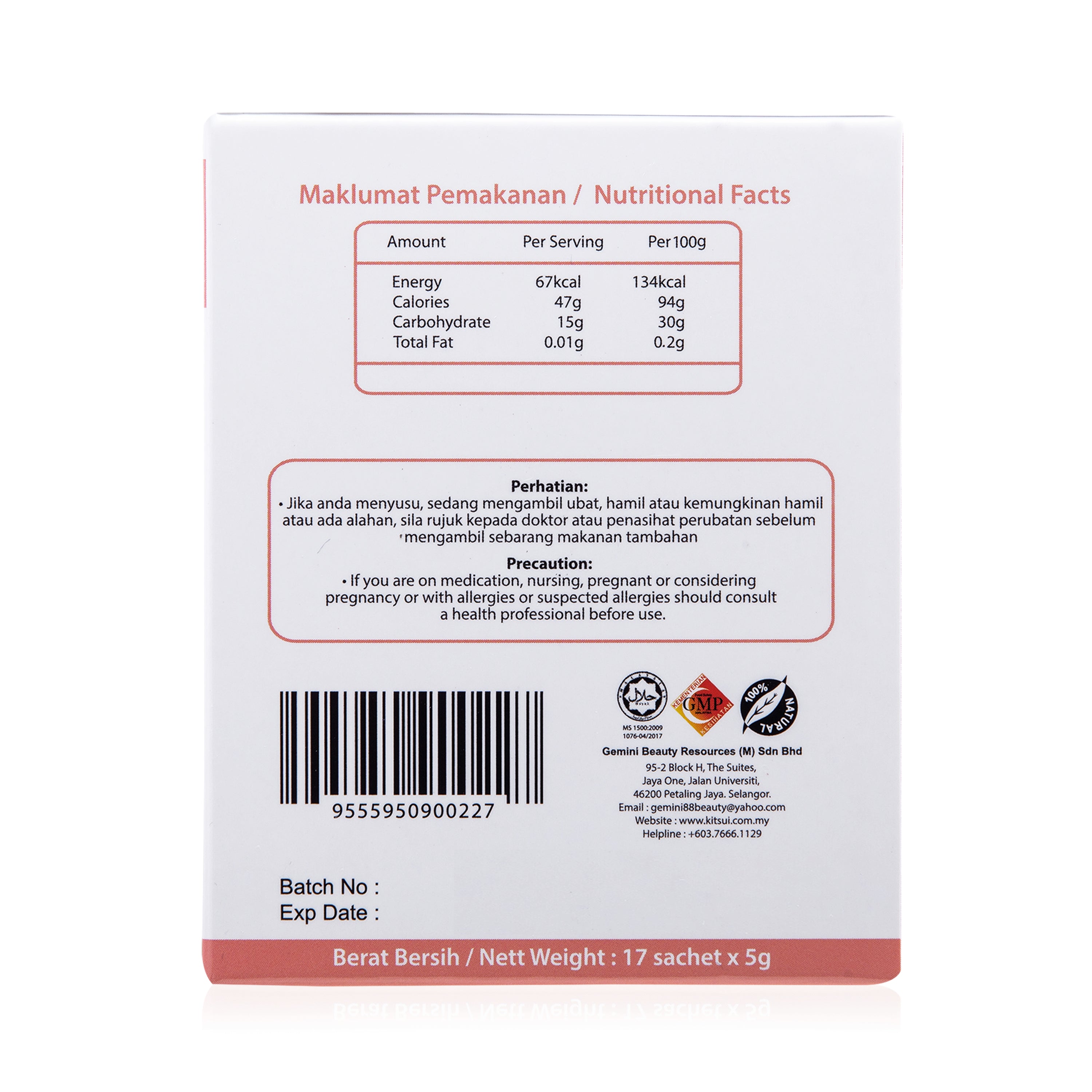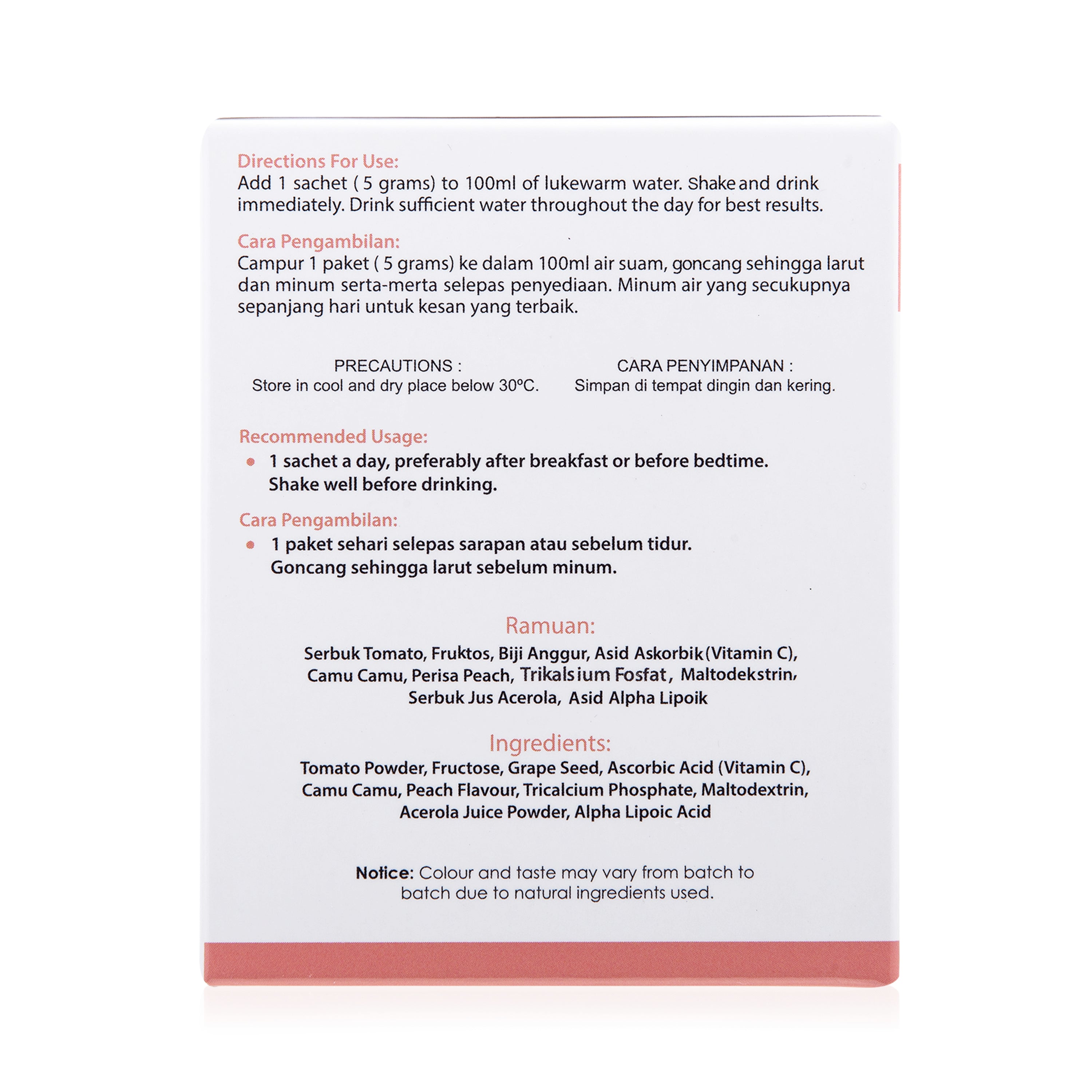 Minuman berperisa pic yang menyegarkan, gabungan kolagen dan ekstrak buah-buahan untuk mengurangkan bintik gelap, blackhead dan kulit kering — untuk kulit lebih cerah dan licin.