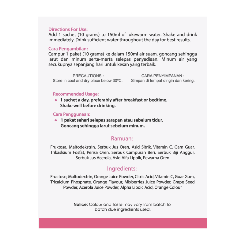 Produk ini adalah makanan tambahan dan bukan ubat. Keberkesanan adalah berbeza bagi setiap individu. Sila rujuk doktor atau pakar kesihatan sebelum mengambil produk ini. Rujuk doktor anda sebelum mengambil produk inijika anda hamil, menyusukan anak, atau sedang mengambil ubat.